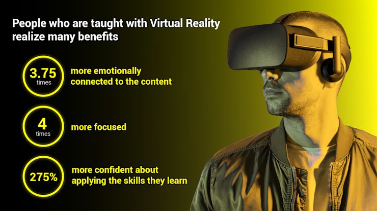 Research reports that immersive technology is a powerful educational tool across emerging economies and low-income communities. According to PwC, people who are taught using virtual reality tech are 3.75 times more emotionally connected to the content, four times more focused than their e-learning peers, and 275% more confident about applying the skills they learn after being instructed through a virtual headset.